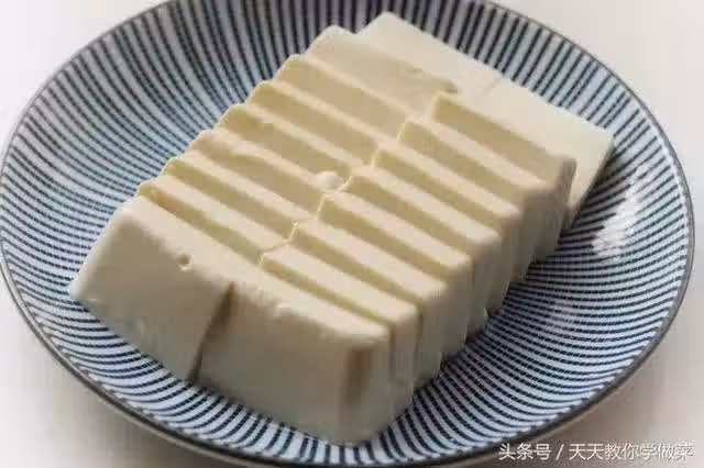 4.因為內酯豆腐比較嫩,為了保持形狀,就直接在盤子裡切幾刀成塊就可以了。