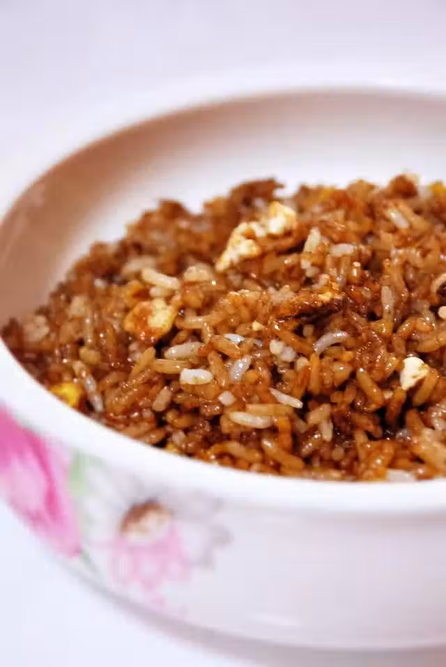 米飯入鍋,加一點點水,然後翻炒,將米飯和雞蛋翻炒均勻。然後,加一點兒生抽,接著加醬油調色