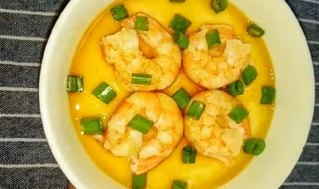 【製作食材】雞蛋兩個、純牛奶、鮮蝦四隻、小蔥一根