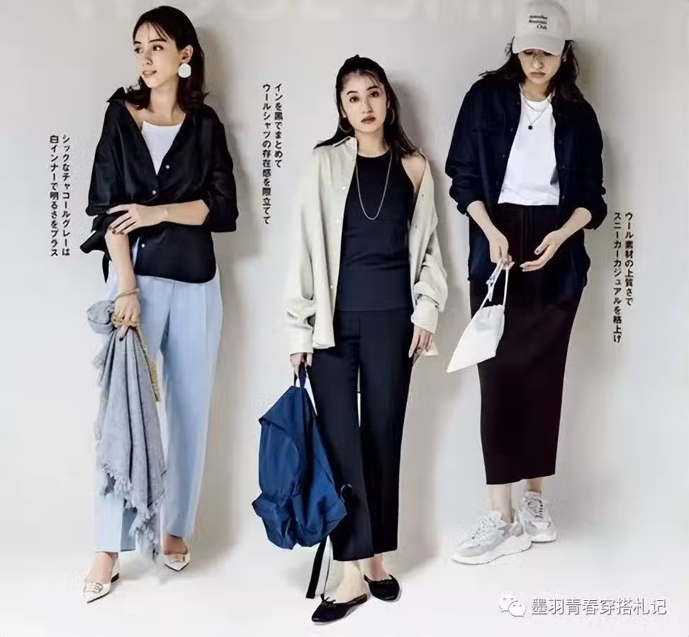 在選擇深色面料時,具有光澤感的絲綢、珠光、冰絲、以及緞面材質可以讓整體造型更加飄逸流動。黑色絲綢襯衫搭配白色弔帶打底和淺色牛仔褲,呈現出清冷的骨感之美。