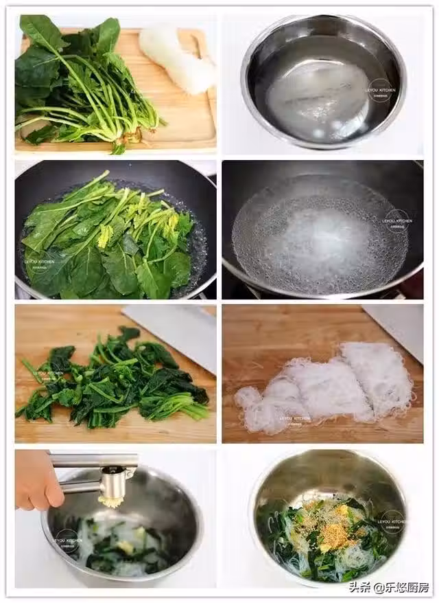 第六步:把粉絲瀝干水分切成段。接下來,把粉絲和菠菜一起放入大盆中。