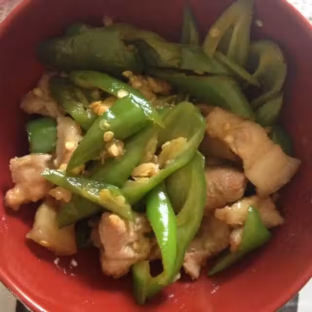 鍋中倒油燒熱放入五花肉炸熟後放大蒜炒出香味再放切好的青椒進去翻炒放適量醬油翻炒,最後放鹽調味出鍋