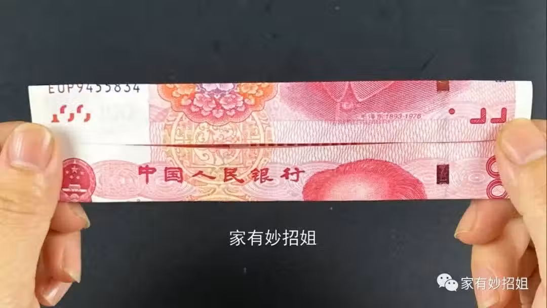 摺疊好,我們注意觀察就可以發現,在中國人民銀行字樣的上方會呈現出一個圓形的圖案,而且在圓形的中間還有一個栩栩如生的鳳凰。真的錢幣,這個圓形上的所有線條都是完全吻合的,反之,假幣就沒有這樣的工藝了。