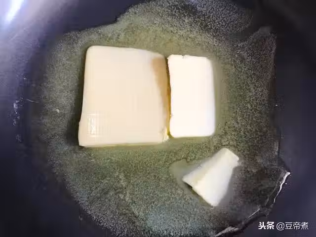 5、倒入棉花糖小火攪拌至棉花糖融合,再順時針攪拌至黃油融合然後倒入奶粉攪拌均勻。