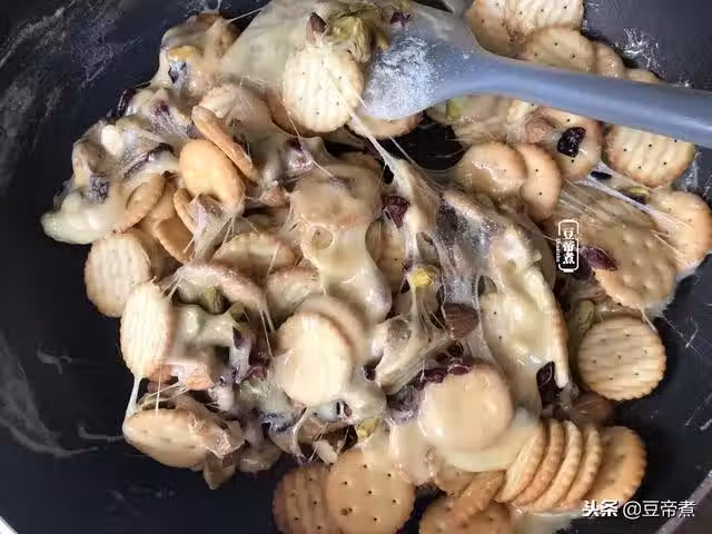 6、待奶粉攪勻後倒入餅乾、果仁和蔓越莓