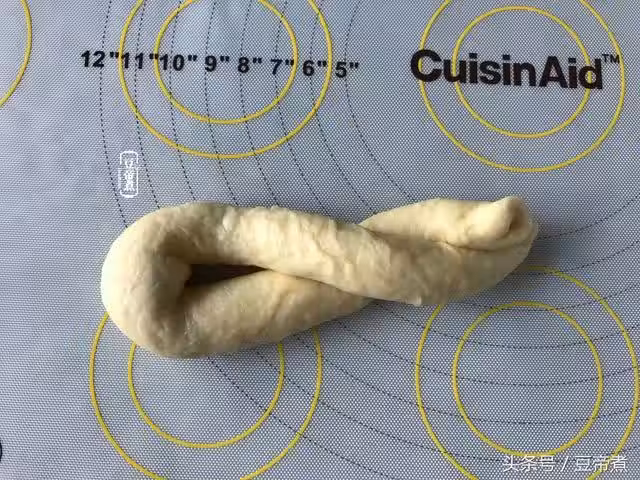 5、把麵糰條稍微再揉長一下,頭尾相連轉兩圈再從圈頭塞入。放在金盤上二發,二發完成後,刷上少許的蛋液。