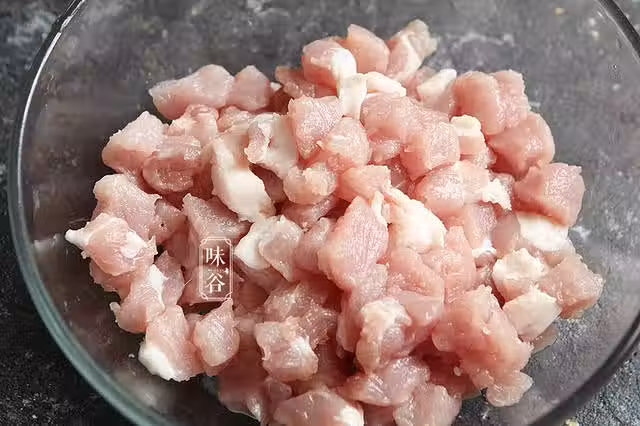 4、腌制好後,放入2大勺麵粉,勺子是盛飯的那種飯勺,然後攪拌到麵粉都黏住瘦肉,這裡要說一下,不是要每塊肉都被麵糊包裹,只要瘦肉沾上面糊就行