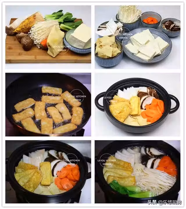 第四步:將蔥段和薑片放入鍋底,然後依次將干皮豆、香菇、杏鮑菇、胡蘿蔔、豆腐放入砂鍋中,再倒入1碗清水。(使用清水,味道略清淡些。也可以倒入一碗高湯,味道會更加鮮美。)