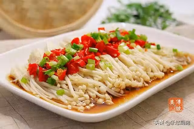 第四步:將拌好的剁椒放入金針菇上。