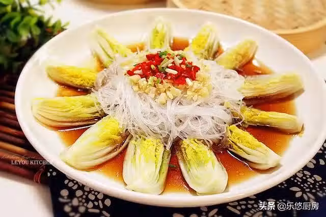第一步:準備食材。娃娃菜三顆、粉絲一小把、蒜適量、食用油適量、剁辣椒適量、鹽適量、糖適量、蒸魚豉油適量、香蔥適量。