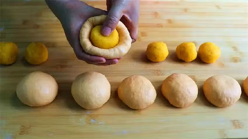 3.餳發好的面放到面板上揉搓排氣,大約需要5分鐘,揉好後搓成長條,切成一樣大的面劑子,把每個面劑子都整理一下,揉圓後壓扁,把放涼的奶黃餡也揉成長條,切成稍微小一點的面劑子,揉圓,用壓扁的麵餅包一個奶黃餡,用虎口處收口,揉圓即可。