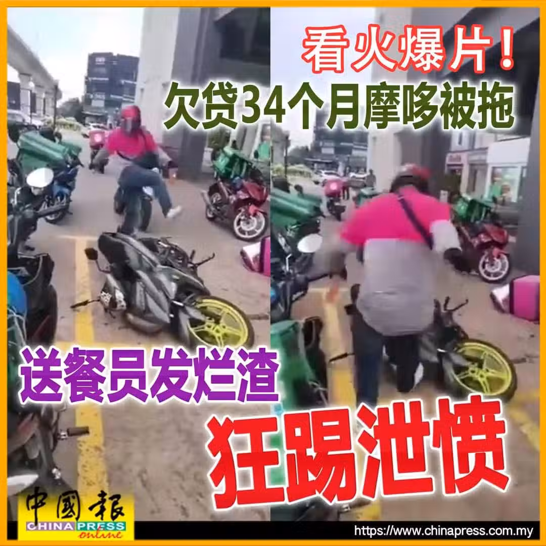 (吉隆坡17日訊)拖欠車貸34個月的送餐員,因不滿拖車公司要拖走其摩哆,竟狂踢摩哆泄憤,導致摩哆零件碎了一地,場面十分火爆!