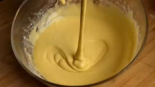 2、蛋黃裡面加50g食用油,然後加入80ml的純牛奶,攪拌均勻,分兩次加入低筋麵粉,攪拌成麵糊後再次加入低筋麵粉,攪拌成這種粘稠度就可以了