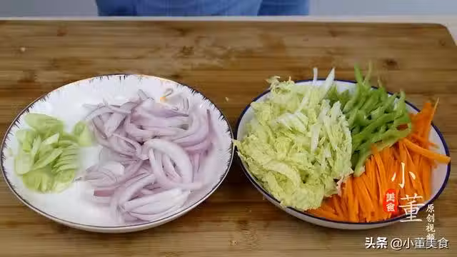 2、洋蔥切成絲,胡蘿蔔削皮切成絲,青椒去頭去籽切成絲,白菜葉切成絲,蔥切成蔥花,碗中打入3個雞蛋,用筷子打散備用;