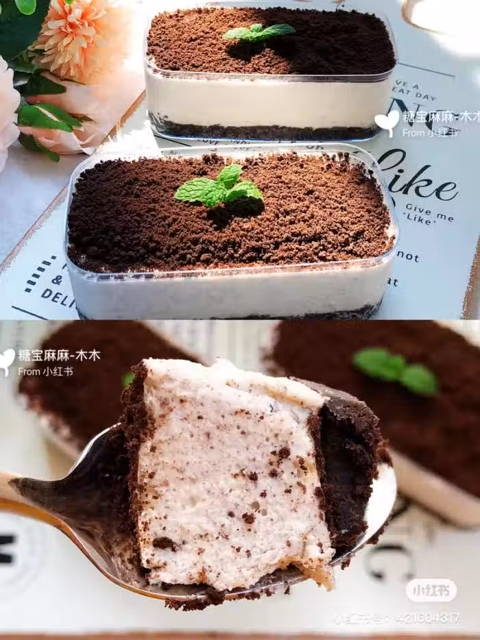 需要的材料:oreo碎80g、黃油30g、淡奶油160g、濃稠酸奶190g、白砂糖30g、oreo碎40g、吉利T片10g