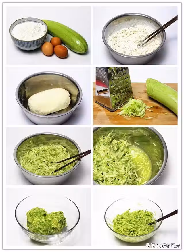 第十一步:將晾涼的雞蛋放入西葫蘆中,再依次放入少許蔥末、蔥末、半小勺雞精、半小勺鹽、半小勺白鬍椒粉、幾滴香油拌勻,餡就做好了。