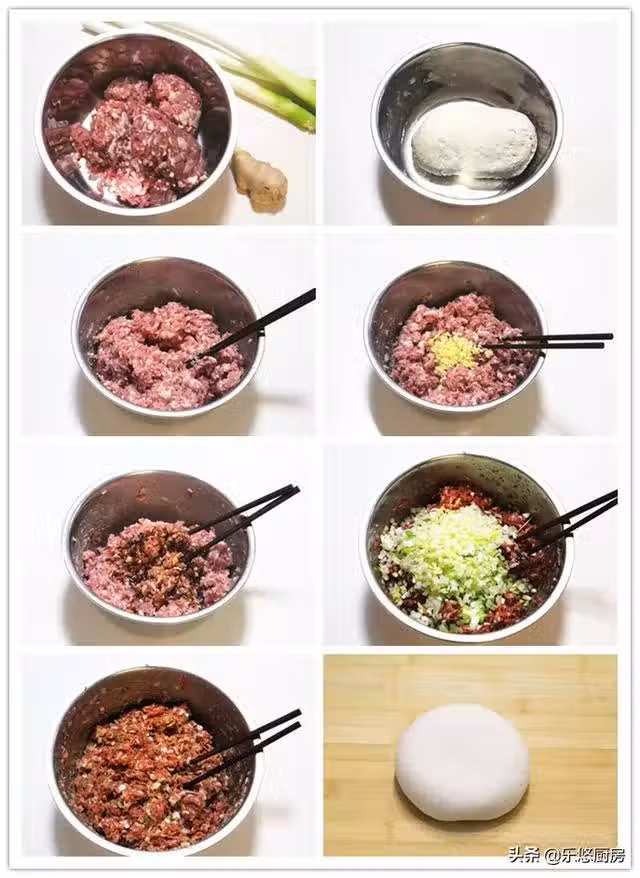 第七步:朝著一個方向用力攪拌肉餡,直至肉餡起勁,感覺攪不動為止。(圖為攪拌好的樣子。因為我用的是現成的豬肉餡,所以大蔥分開放。如果你用的是豬肉,可以直接大蔥剁到肉中,那樣味道更好)