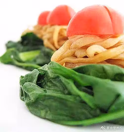 5、用筷子捲起麵條,擺造型放入盤中,菠菜為衣,小西紅柿做頂。