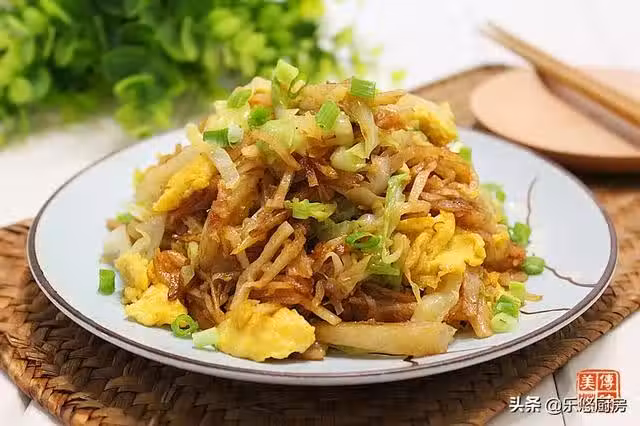 第一步:準備食材。餅絲300克、圓白菜300克、雞蛋3個、蒜適量、蔥適量。(為了省事,我用的是現成餅絲。親們也可以將家常餅切成絲來用)