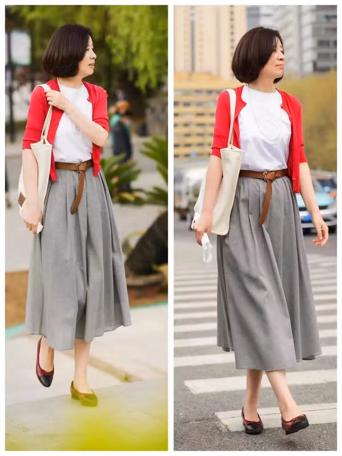 50歲別總穿緊身褲,學這位阿姨百褶半裙搭配,優雅氣質又大方