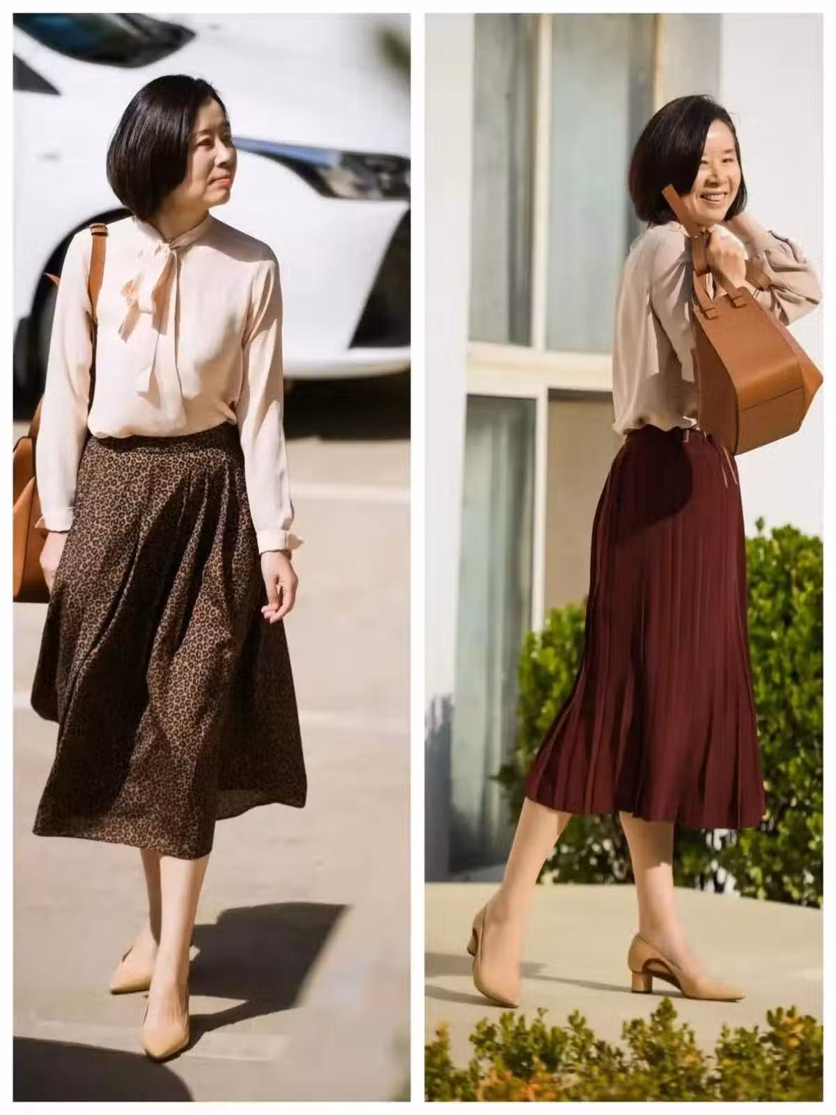 50歲別總穿緊身褲,學這位阿姨百褶半裙搭配,優雅氣質又大方