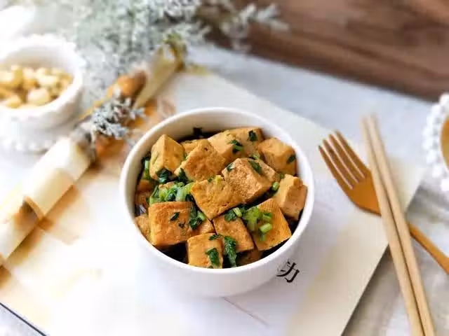3. 熱鍋上油,下豆腐粒煎到焦黃