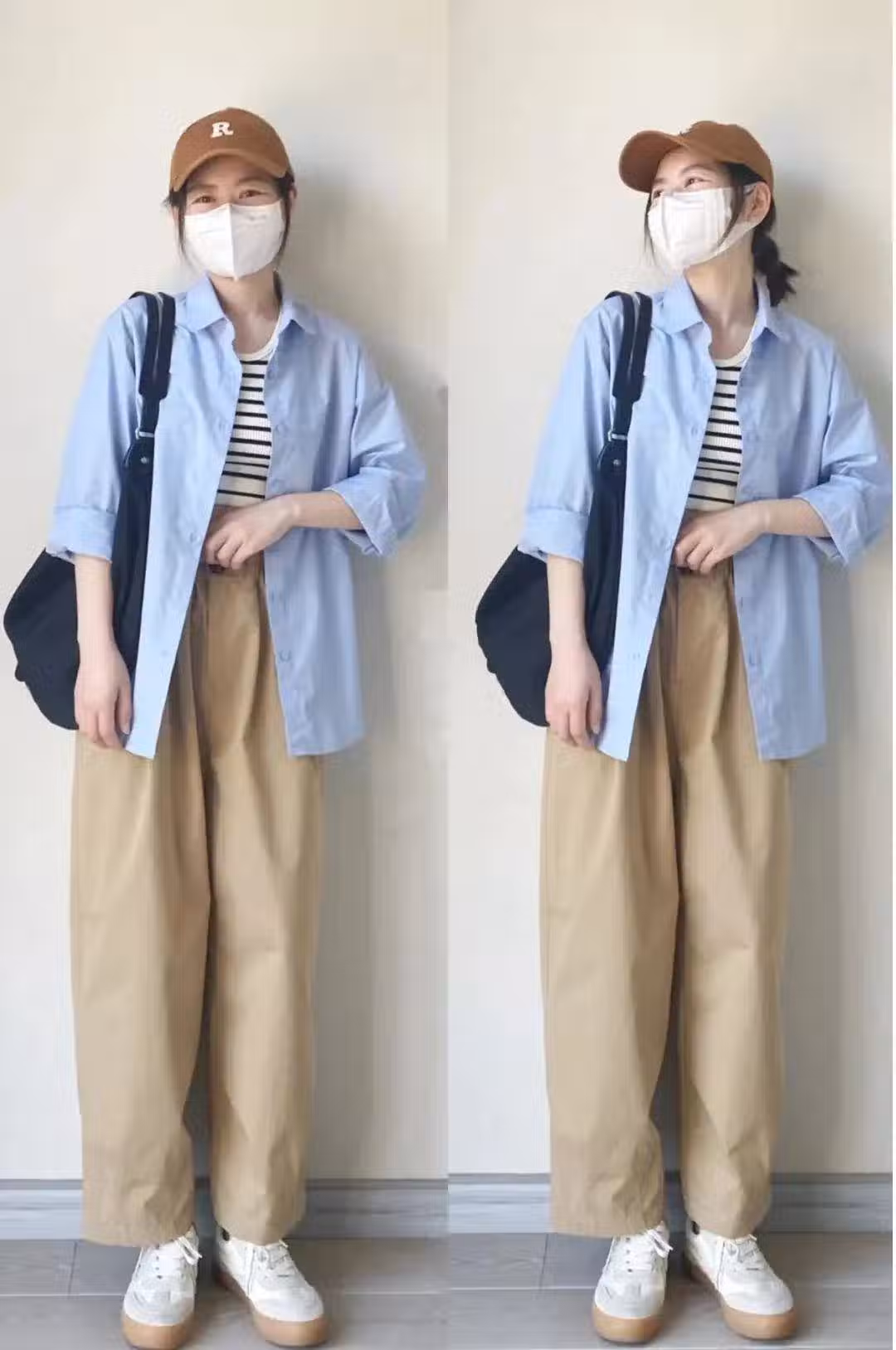 春夏的疊穿大多以襯衫為主,可以試試天藍+卡其撞色穿搭,天藍色襯衫疊穿條紋內搭,非常有韓系那味兒,棒球帽就和褲子相呼應就好了。