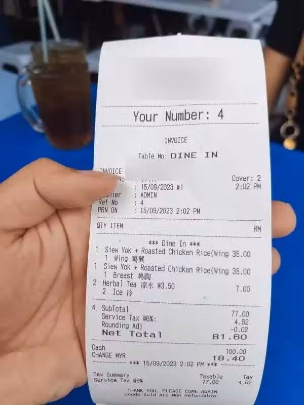 有網民分享在吉隆坡某燒臘店用餐的收據,2碟燒肉加雞和2杯涼水,加上6%銷售稅,一共花費81令吉60仙,人均40令吉80仙。
