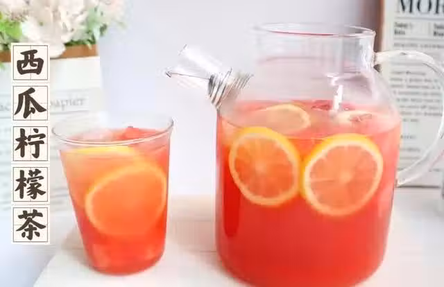 綠茶3包,開水適量,冰糖適量,西瓜,西瓜汁,檸檬1個,冰塊。