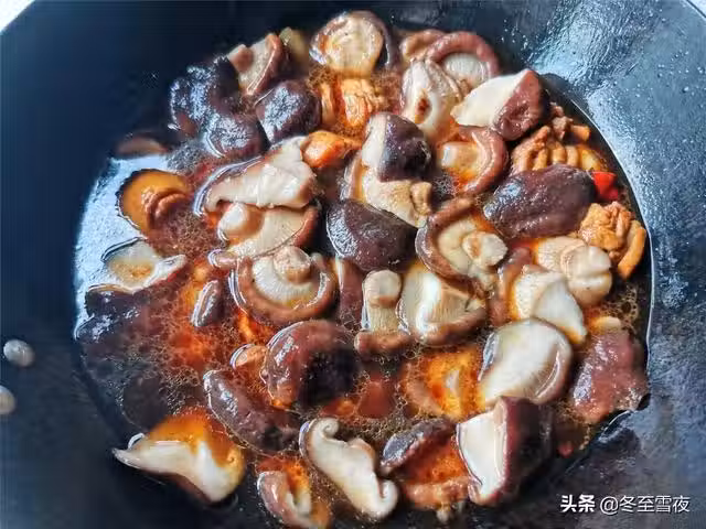 8.下入香菇一起翻炒均勻,淋入熱水,水量和食材持平就可以了,再加入白糖,大火燒開,轉小火燒制入味。