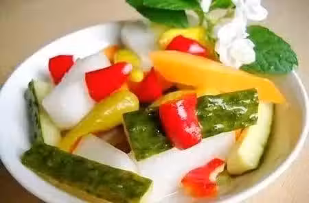 黃瓜150g、白蘿蔔100g、胡蘿蔔100g、野山椒1瓶、紅椒1個 醋少許