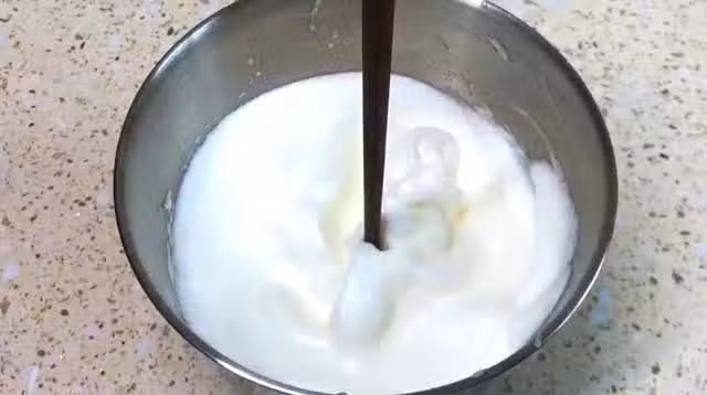 蛋白分2次倒入蛋黃中,像炒菜一樣翻拌均勻,千萬不能攪拌,這樣容易把蛋清的泡消掉,蒸出來的蛋糕就不起發了。