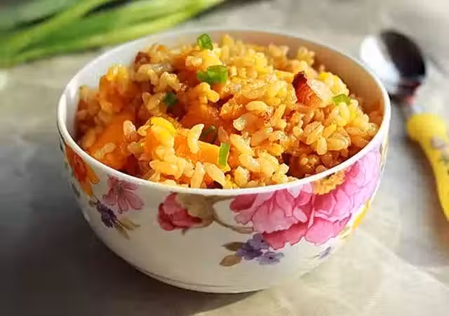 剛燜好的南瓜飯。稍稍攪一下,讓飯跟南瓜混合,開吃。