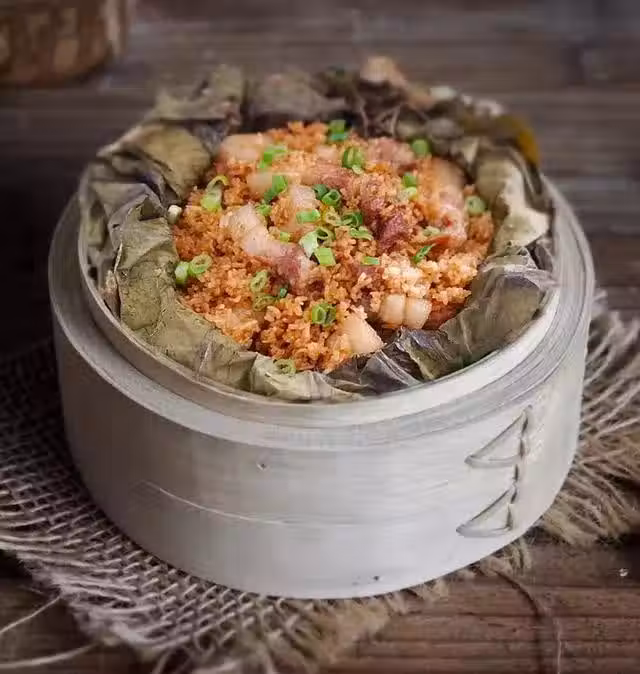 大米250克、五花肉塊400克、荷葉1張、蔥5g、五香粉1茶匙、白糖1勺、黃酒1勺、生抽2湯匙、老抽1勺、香油1茶匙、雞精1茶匙