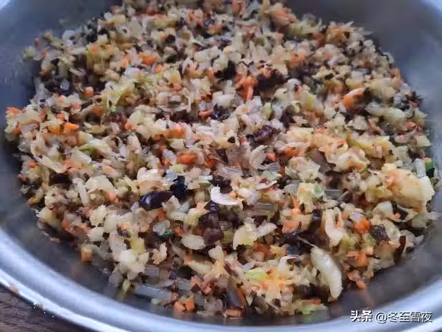 7.將白菜末,胡蘿蔔末,粉條段,木耳末,一起放在盆內,加入蝦皮,蔥薑末。