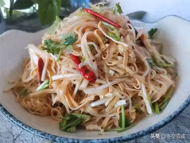 7.鍋加水燒開,下入干豆腐絲焯水2-3分鐘,將干豆腐絲炒變軟,去除干豆腐絲的豆腥味。把干豆腐絲撈出,放在冷水中投涼,撈出,攥凈水分待用。