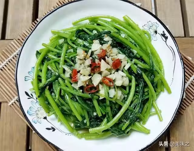 茼蒿菜300g、蒜末適量、泡椒1個、油適量、鹽適量。