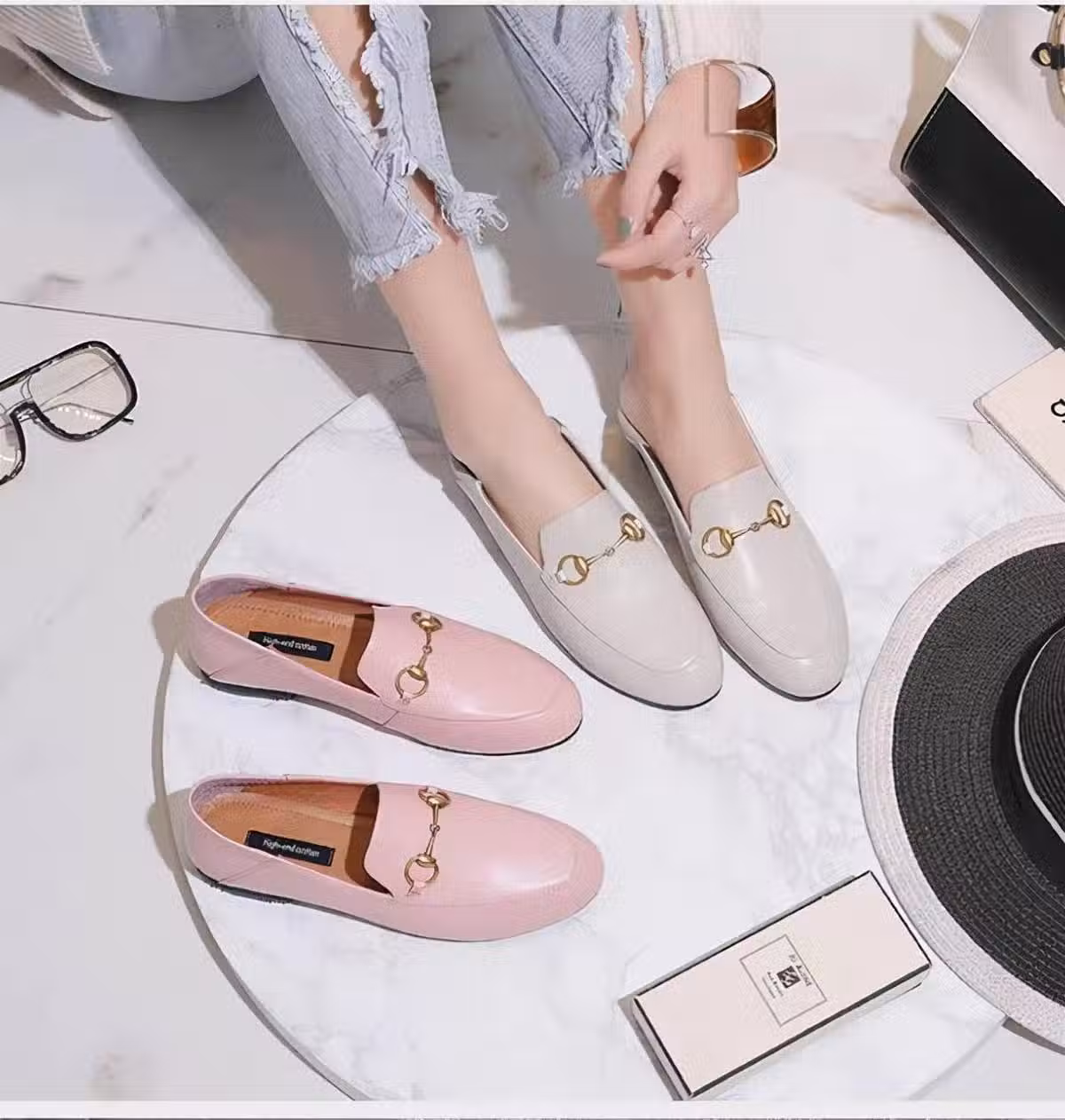 圓尖頭的鞋子氣質綜合,不太挑剔年齡段。如果追求時髦,還想體現年輕態,不妨用淺色調來加強圓尖鞋頭的存在感,比如米色樂福鞋就很受歡迎。