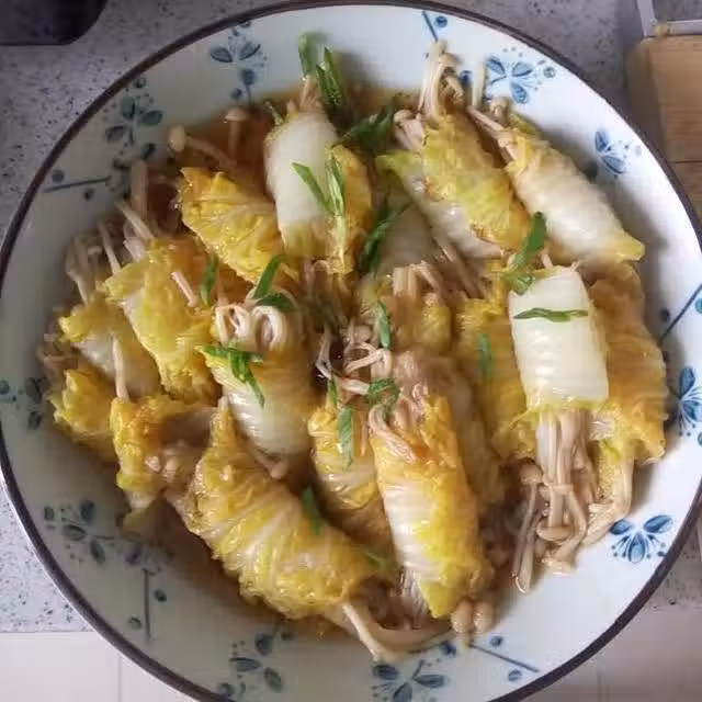將白菜鋪開,根據白菜葉的大小捲入適量金針菇