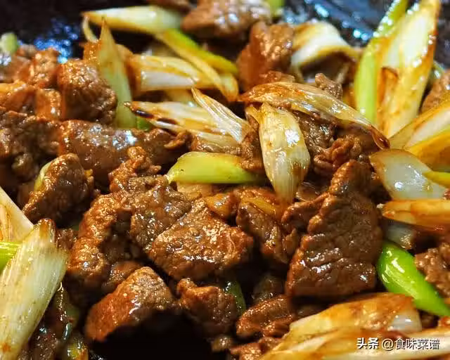 5.、加入腌制好的羊肉片,快速翻炒至變色,再加入大蔥段,大火快速翻炒,斷生即可。