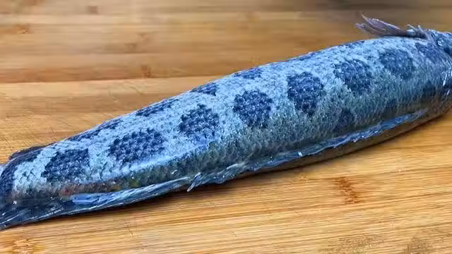 2.用一塊抹布把魚身包住,然後從魚尾處往上貼著魚骨切開,把魚肉和魚骨分離開,切到魚頭地方把魚肉切下來,另外一面也按照這個方法把魚肉取下來。然後把魚頭從中間切開,一分為二,再把魚頭最前面的一段也切掉,這個地方是魚牙不能吃,而且非常的堅硬。然後把魚頭切成小塊,魚骨也切成3~5公分左右的段。
