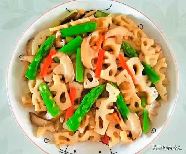 蓮藕1節、甜椒半個、蘆筍4根、香菇5個、蔥1段、蒜3瓣、油少許、蚝油少許、鹽少許、五香粉少許。