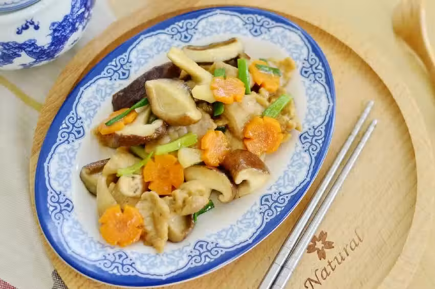 材料:裡脊肉 輔料:鮮香菇 胡蘿蔔 蒜片 香蔥