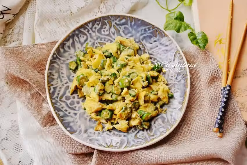 然後熱鍋熱油,將秋葵倒入雞蛋液中拌勻,接著直接倒入鍋裡面,看稍微凝固了就開始翻炒,放點鹽調味,翻炒上色就可以了。