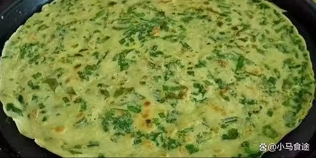 2.平底鍋刷上一層薄油,稍稍預熱,把雞蛋韭菜糊倒入鍋中攤平攤成薄餅,翻面煎至兩面熟透,即可出鍋裝盤。