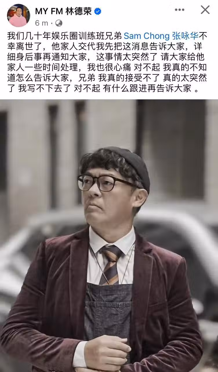 (吉隆坡27日訊)本地資深藝人張詠華 (SAM哥)今日傳出驟逝消息,震驚娛樂圈,張詠華生前剛拍完2024年賀歲動作喜劇電影《龍龍龍龍龍》,本地知名DJ兼該片總監製的林德榮貼出張詠華劇照,並代其家人公開這項不幸消息:「我們幾十年娛樂圈訓練班兄弟張詠華不幸離世了,他家人交代我先把這消息告訴大家,詳細身後事再通知大家。」