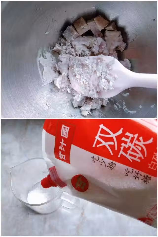 5. 接下來做芋圓:將蒸好的芋頭用鏟子碾成泥(紅薯、紫薯也是同樣的操作)。6. 稱出少許白砂糖,加少許涼開水,攪拌至完全溶解。