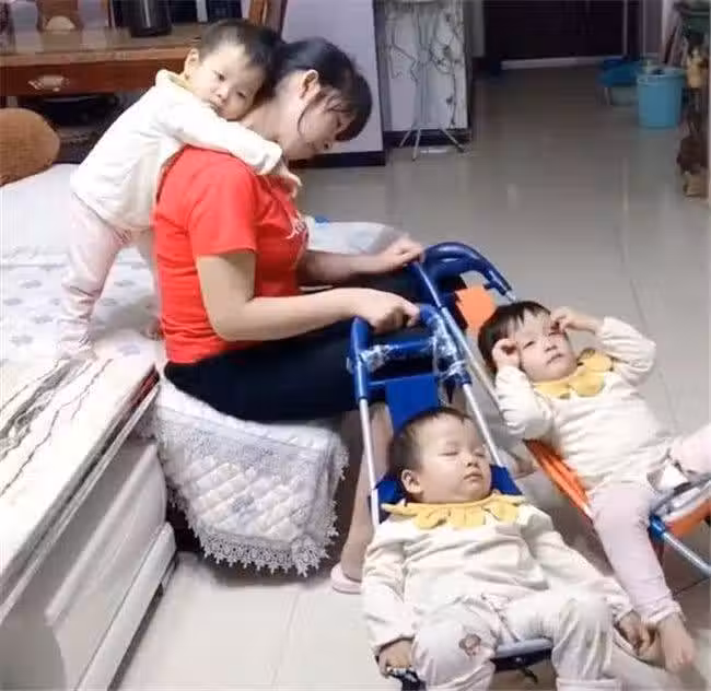 晚上8點多,只看見客廳裡只有妻子和三胞胎兒子。其中兩個兒子躺在小推車裡,妻子兩隻手來回推,哄兒子睡覺,而另外一個兒子則趴妻子的後背上,妻子連頭都抬不起來。妻子看起來憔悴了很多,不像只有二十四的小姑娘,反而像三十多歲的大媽。聽到開門聲,妻子轉過頭來看了一眼,眼裡沒有驚喜,反而是疲憊的眼神,好像很久沒有休息過一樣。