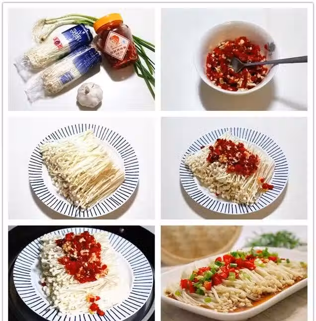 第六步:將蒸好的金針菇從鍋裡取出,倒掉盤中多餘的湯,再倒入適量的蒸魚豉油,然後澆一點熱油,撒上香蔥末即可上桌。(剁辣椒和蒸魚豉油中都有鹽味,所以不用再放鹽。)