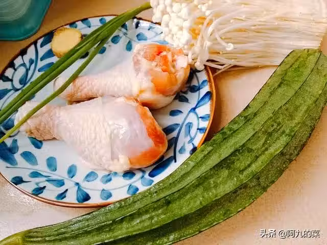 2.然後將食材進行初步的處理:絲瓜去皮切滾刀塊,雞腿斬成大塊洗乾淨,金針菇去除根洗凈摘成小朵,香蔥洗凈切末,生薑去皮切片